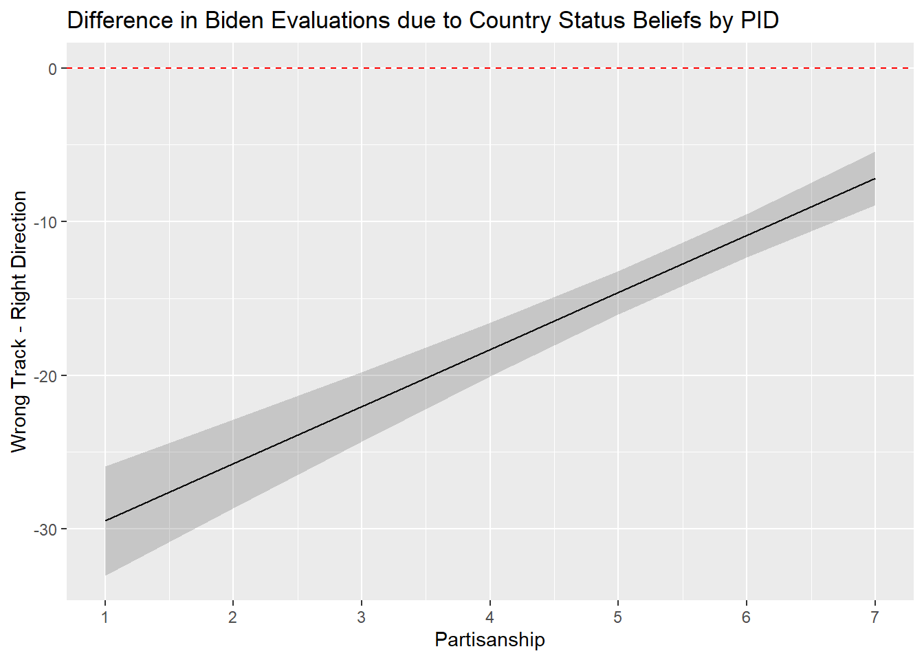 pid: This tells us the expected effect of thepidvariable when theright_trackvariable takes on a value of 0.right_trackis a factor variable, so the coefficient forpidtells us the expected effect ofpidamong people who say the country is heading down the “Wrong Direction” since that is the “reference” category of the factor variableright_track. We expect to see a negative relationship betweenpidand the DV among these people.right_trackRight Direction: This tells us the expected effect of theright_trackvariable whenpidtakes on a value of 0.right_trackis a factor variable comparing those saying the country is heading in the right direction against those saying it’s heading in the wrong direction. Thus, this coefficient indicates that we expect people who said the country was heading in the right direction would evaluate Biden worse than those who said it was heading in the wrong direction among those with apidvalue of 0.1pid:right_trackRight Direction: This coefficient can be used to say how the effect of “pid” changes when “right_track” increases by 1 unit or, alternatively, how the effect of “right_track” changes when “pid” increases by 1 unit.