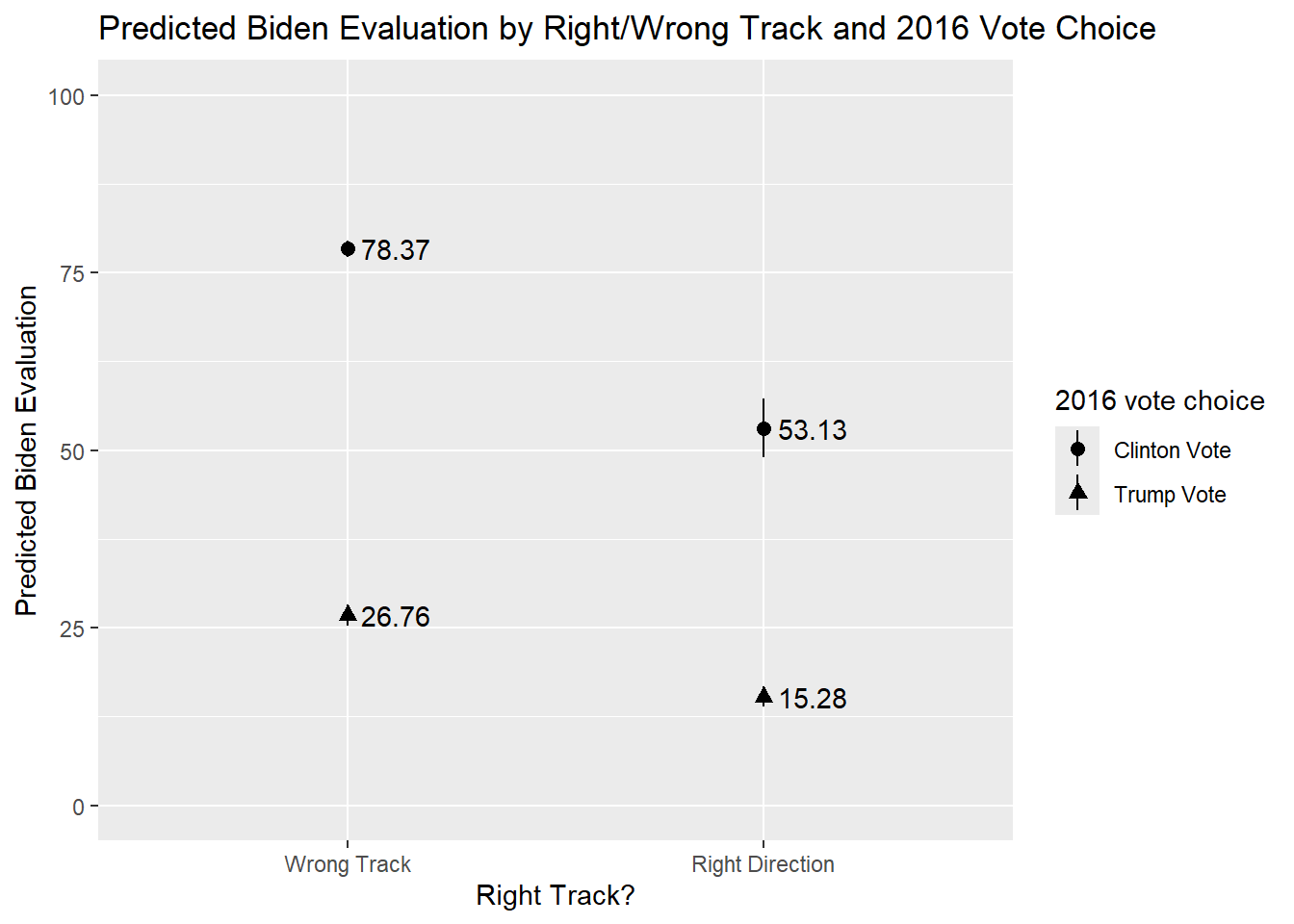 labs(title = "Predicted Biden Evaluation by Right/Wrong Track and 2016 Vote Choice",