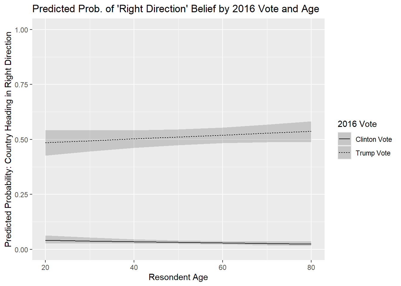 labs(title = "Predicted Prob. of 'Right Direction' Belief by 2016 Vote and Age",