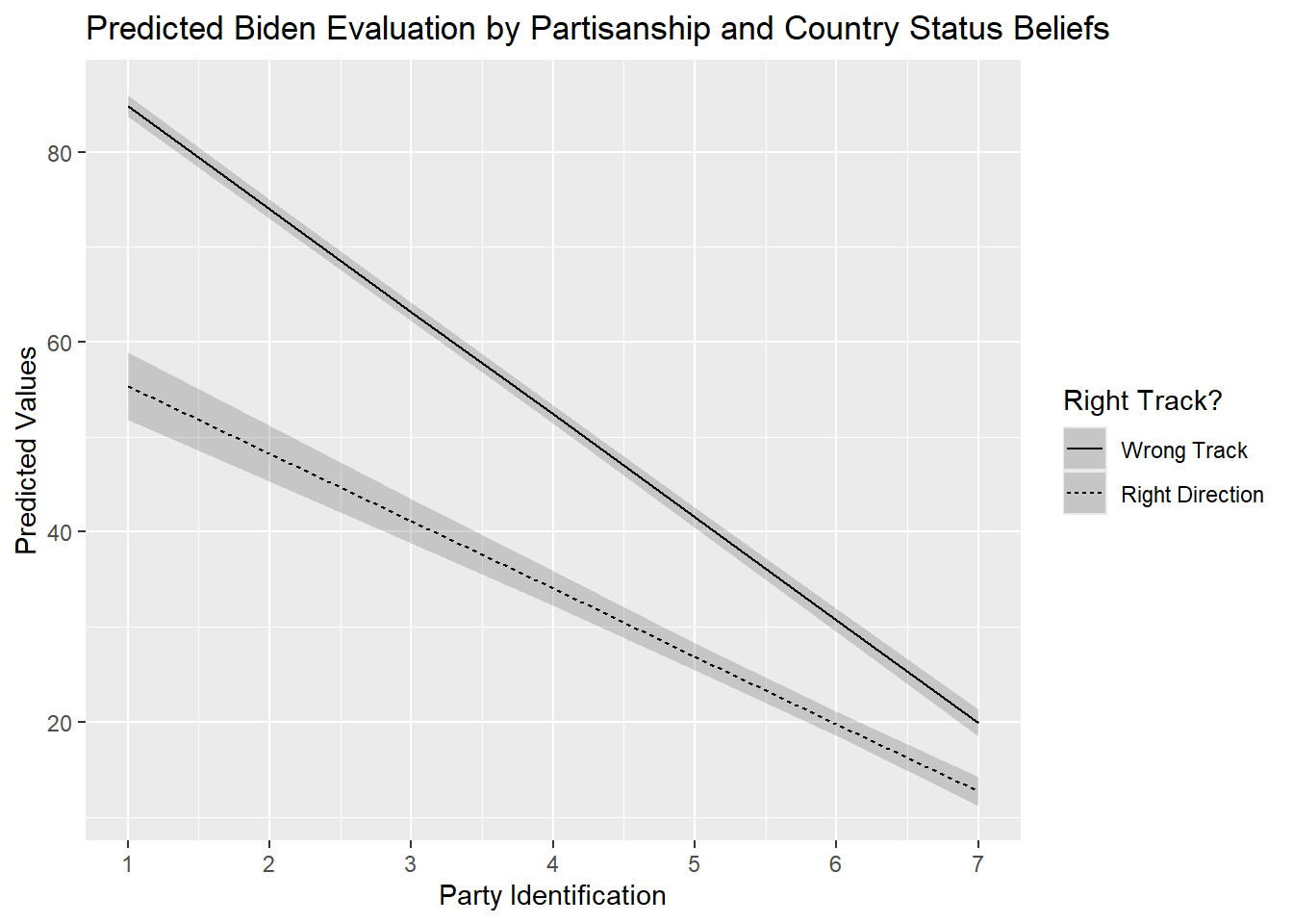 Previously, we predicted Biden evaluations based on an interaction between a continuous variable (partisan identity, pid) and a binary variable (an evaluation of whether the country is on the right track or not, right_track).