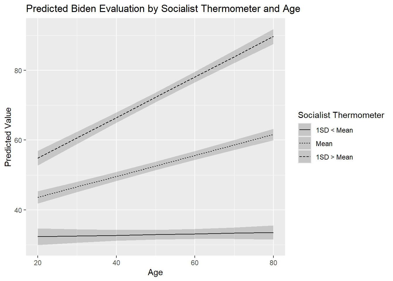 labs(title = "Predicted Biden Evaluation by Socialist Thermometer and Age",