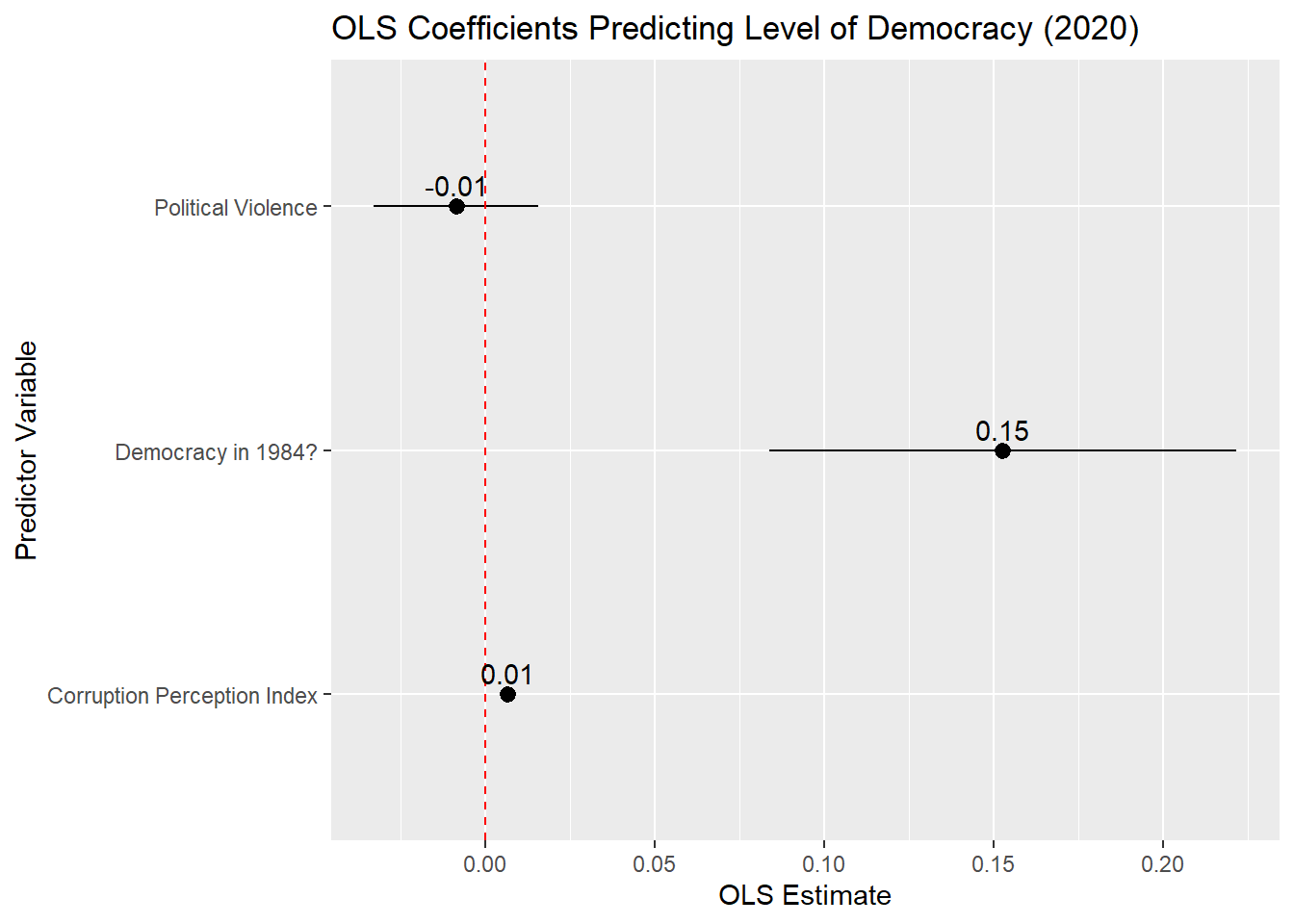 - Providing a reference line at 0 is good practice as this helps readers understand whether a coefficient is statistically significant (at least, at p < 0.05).