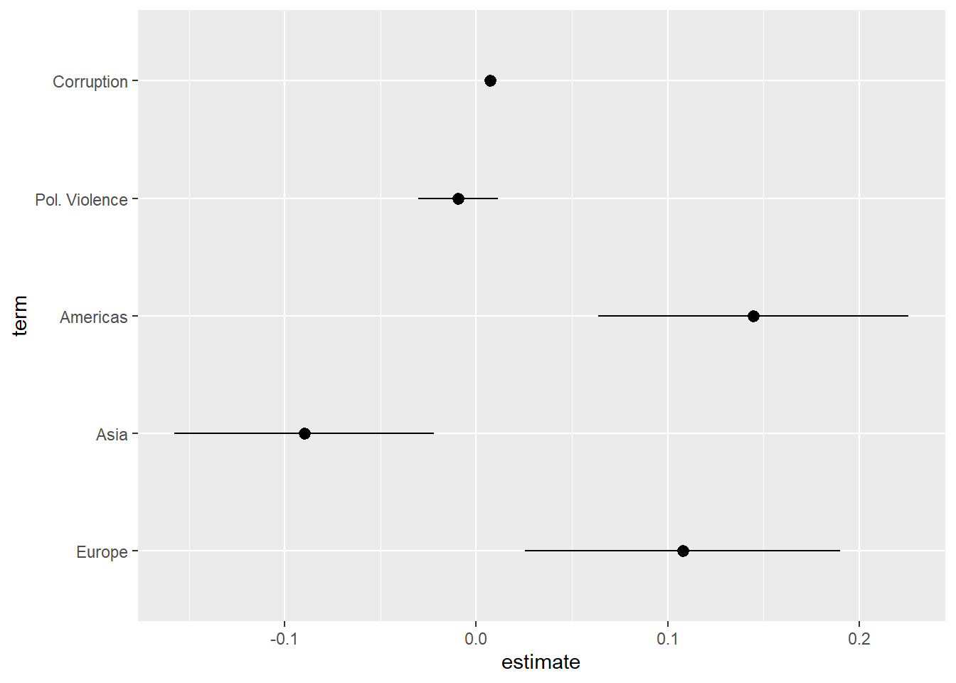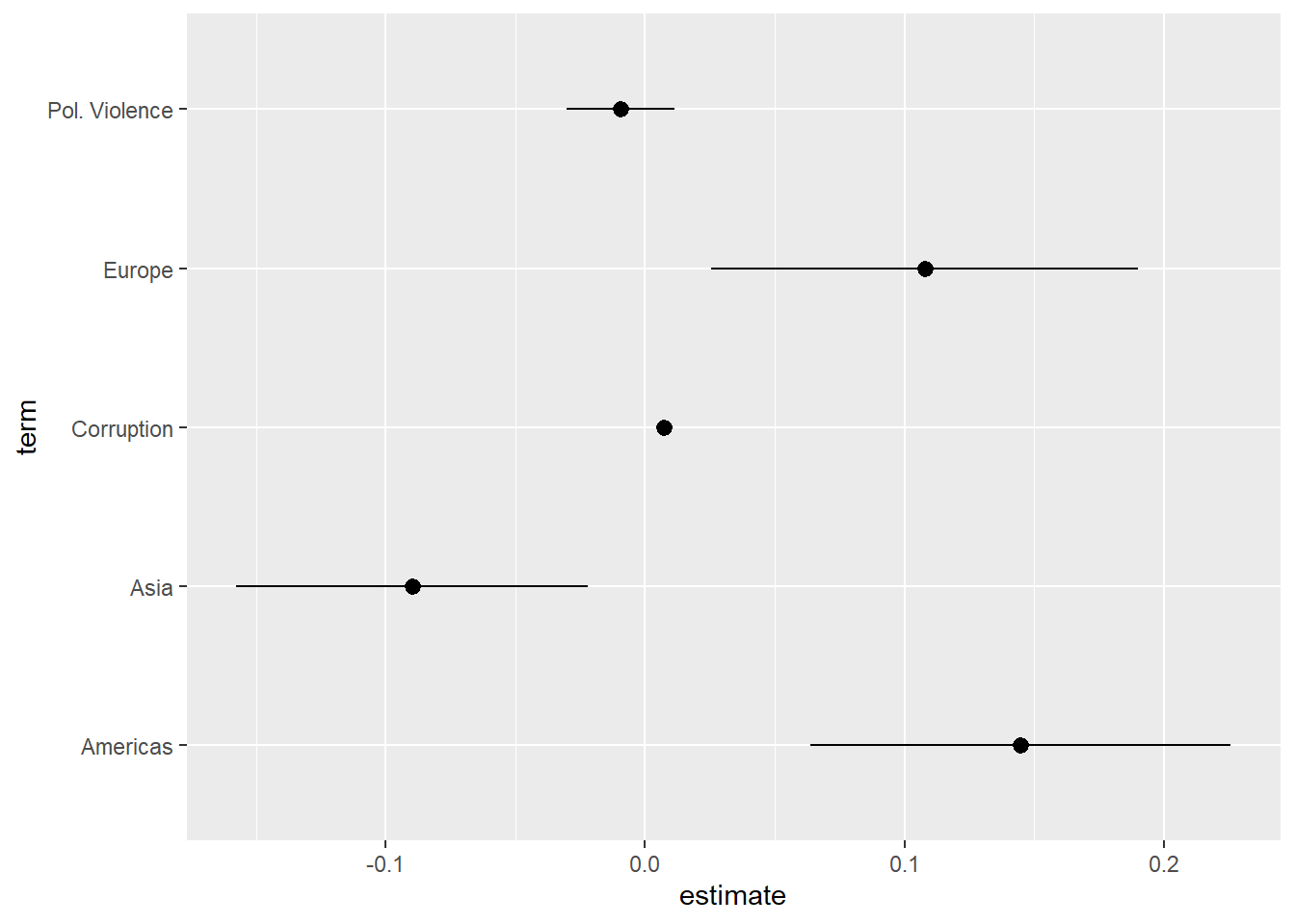 termvariable into a factor variable before making the plot in order to control the order in which variables are arranged on the figure.↩︎If we put the coefficient estimates on the y-axis instead, then we would use “ymin” and “ymax” instead.↩︎