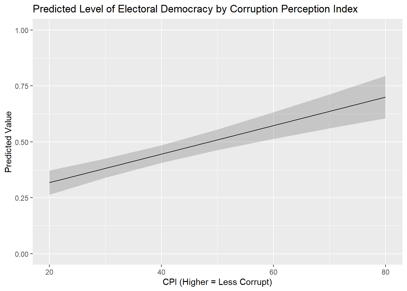labs(title = "Predicted Level of Electoral Democracy by Corruption Perception Index",