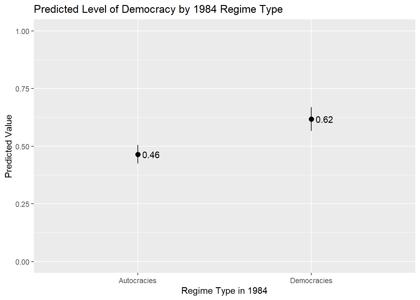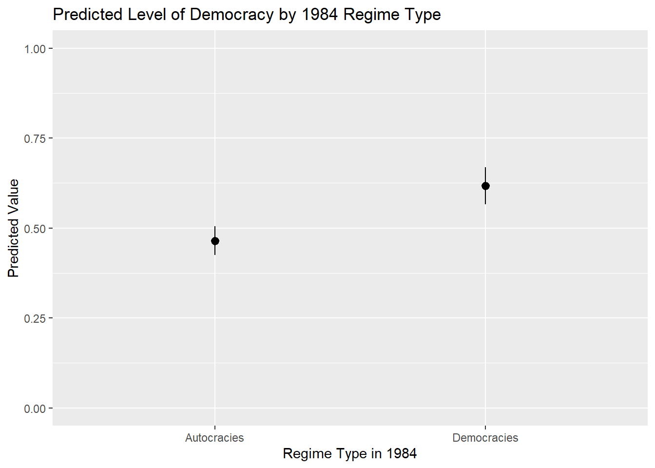 labs(title = "Predicted Level of Democracy by 1984 Regime Type",