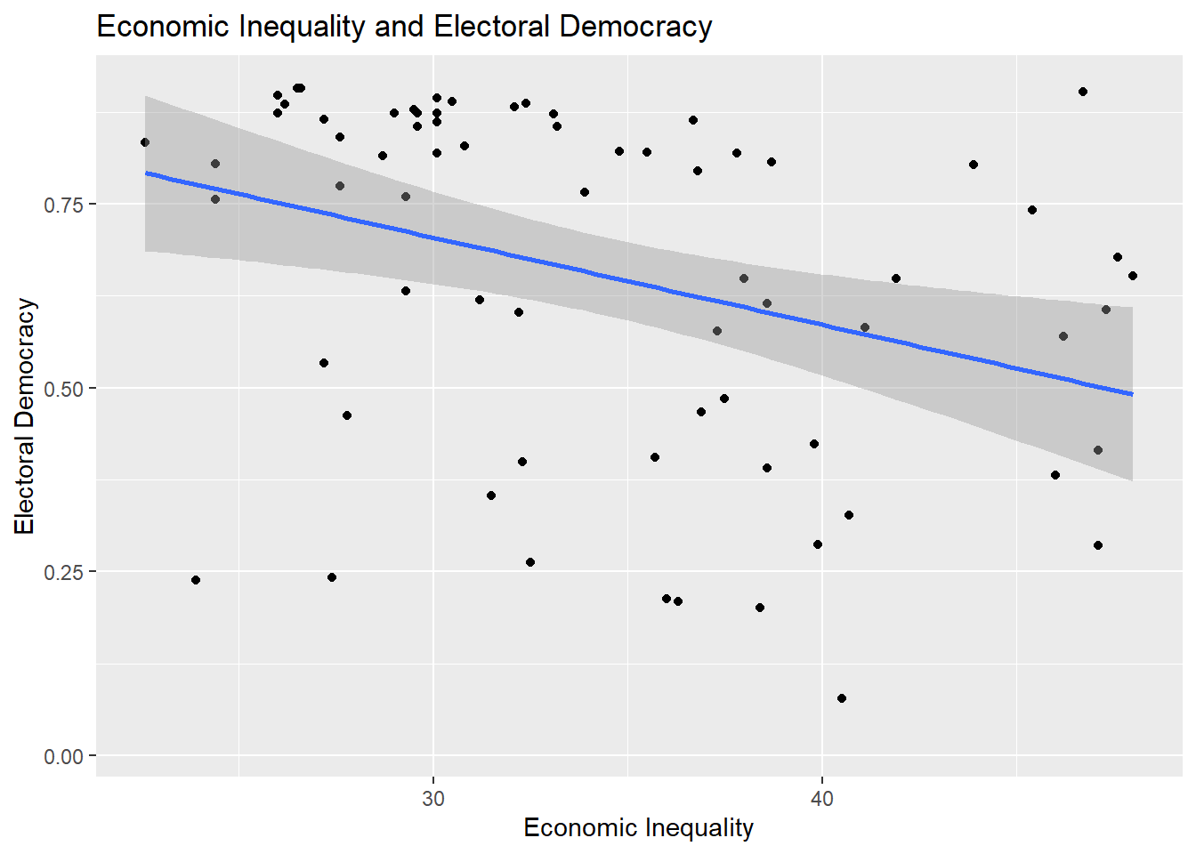 scale_y_continuous()to make sure that the y-axis stretches from the min to the max value of the DV. This can help avoid situations whereggplot()shows only a truncated stretch of the y-axis thereby potentially giving a false impression of the magnitude of the change in Y across the range of X. This type of rescaling is not always needed, and can sometimes create its own problems, but it is something to reflect on before communicating statistical results. The sociologist Kieran Healy provides a further discussion of these competing considerations in his book on data visualization.