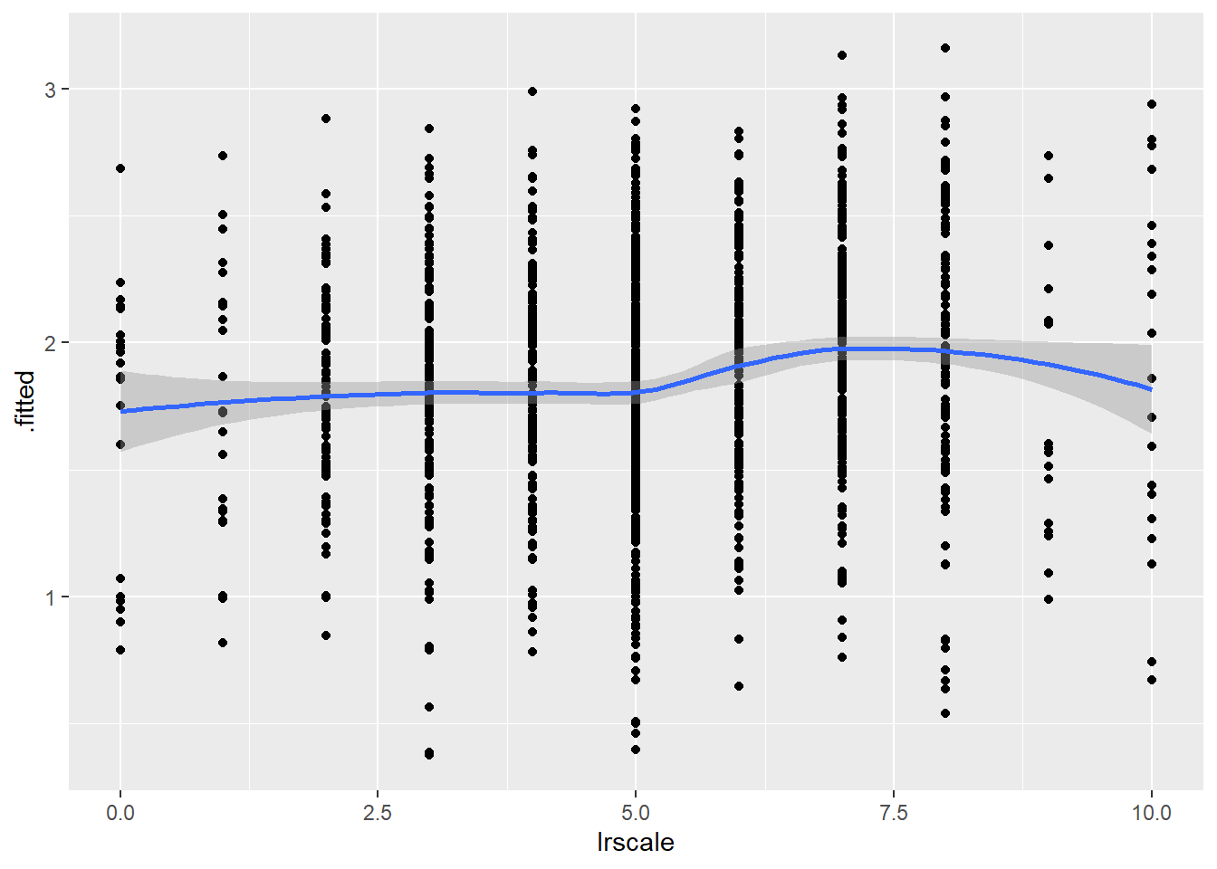 ggplot(model4_augmented, aes(x = lrscale, y = .fitted)) +